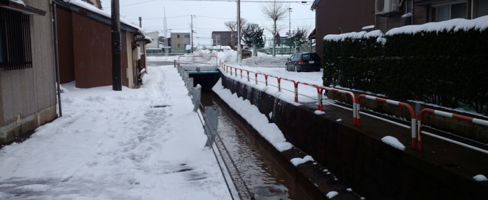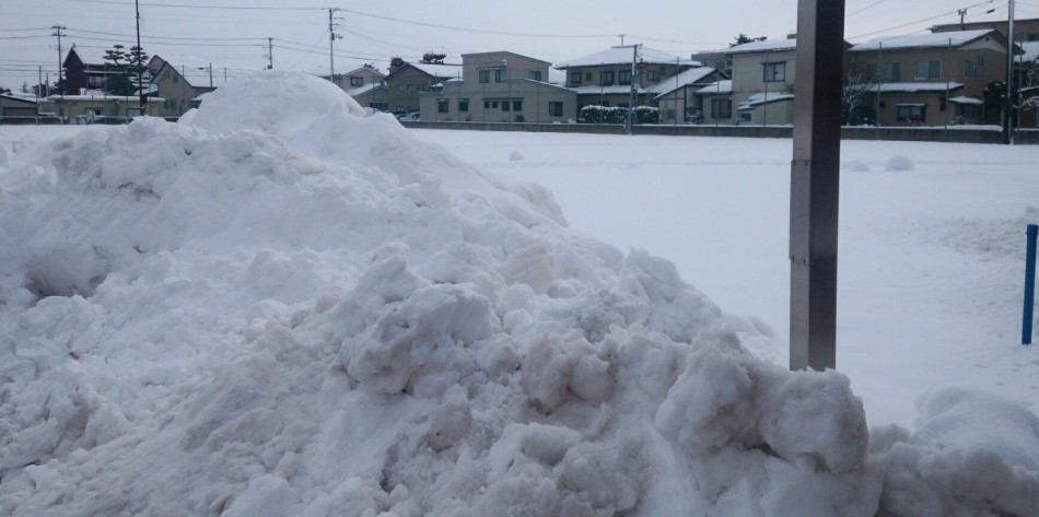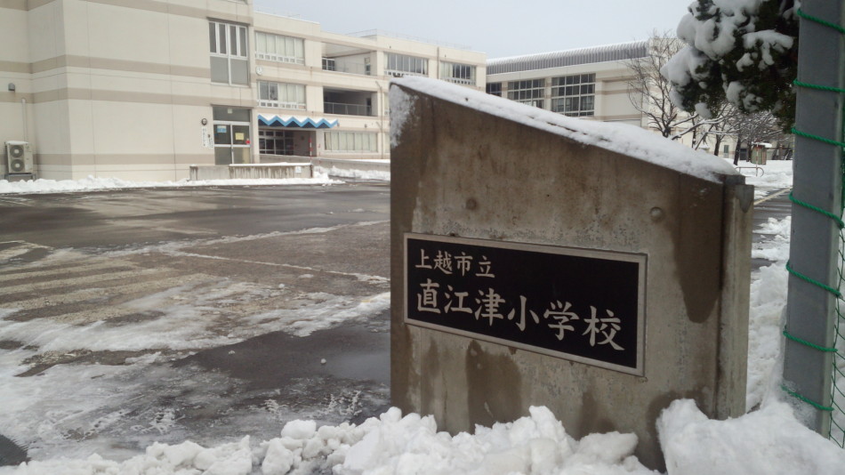 今回は、我が母校直江津小学校付近です 平成21年度に改築しました グラウンドは一面雪、所々に子供達が作った雪玉も転がっていました